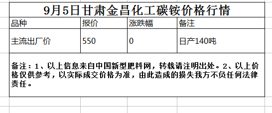 9月5日甘肅金昌化工碳銨價(jià)格行情