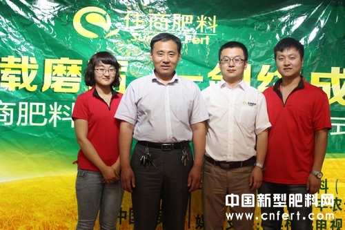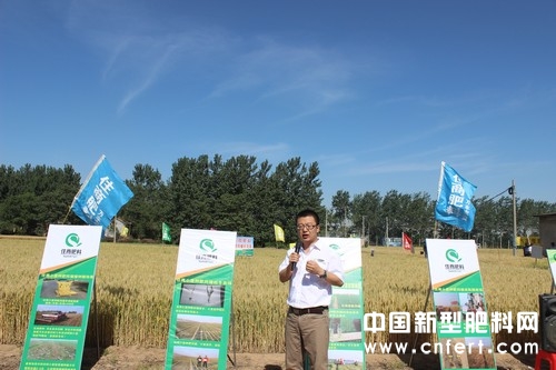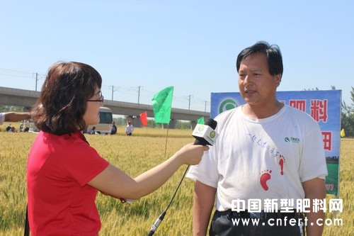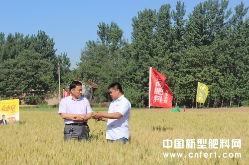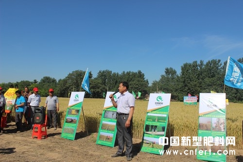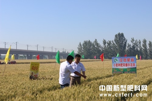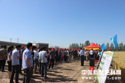 中國新型肥料網訊:示范田里一片金黃,小麥長勢喜人,豐收在望。2014年5月28日,住商肥料踩著小麥成熟的節奏,來到河北省吳橋縣召開“住商肥料小麥種肥同播示范觀摩會”。此次觀摩會由住商肥料同吳橋萬豐農資聯合舉辦,華文傳媒、中國新型肥料網全程策略支持跟蹤報道,同時邀請了中國農業大學吳橋攻關試驗站站長魯來清教授現場培訓指導,并有來自河北景縣、吳橋的300多名機播手和農民參加了本次會議。 吳橋萬豐農資張風浩總經理表示,吳橋縣小崔村這片示范田,只澆過一次水,未施過一粒尿素,全部使用住商小麥肥,采用種肥同播,寬窄行播種模式。示范田里一片金黃,粗壯的桔桿上挑著蓬乍乍的穗頭。”我從三四年前就開始使用住商肥料,原來我是一年使用一種肥料,經過對比,最終選擇了住商肥料,這幾年一直連續使用住商肥料,用住商肥料麥稈粗壯、麥粒飽滿、抗倒、抗病,時效長、含量高,雖然我的麥子只澆了一水,但是預計畝產能達1400斤“,來自吳橋鐵城鎮的農戶王振營高興地和大家分享著即將豐收的喜悅。