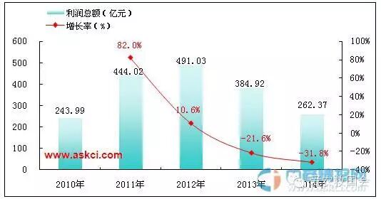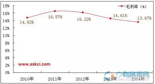 表1 2010-2014年肥料制造行業(yè)主營業(yè)務(wù)收入情況統(tǒng)計 2014年我國肥料制造行業(yè)主營業(yè)務(wù)收入9082.61億元,同比增長4.6%。2010-2014年,我國肥料制造行業(yè)主營業(yè)務(wù)收入整體上升,主營業(yè)務(wù)收入增長趨緩。 表2 2010-2014年肥料制造行業(yè)利潤統(tǒng)計 表3 2010-2014年肥料制造行業(yè)毛利率統(tǒng)計 據(jù)統(tǒng)計,2014年肥料制造行業(yè)利潤總額262.37億元,同比下降31.8%。2012-2014年利潤總額持續(xù)下降。2011-2014年我國肥料制造行業(yè)利潤總額增長率持續(xù)下滑。2014年肥料制造行業(yè)毛利率13.67%。2010-2014年我國肥料制造行業(yè)毛利率增長較平穩(wěn),起伏波動較小。 |
